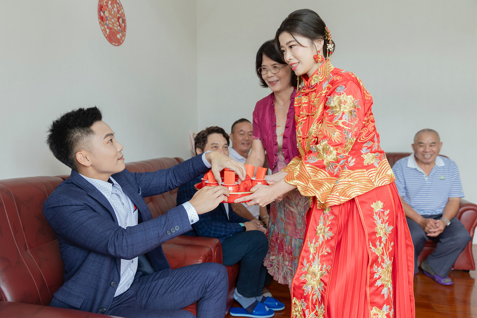 男方於家中祭祖後,便可鳴炮開車前往女方家。要注意禮車的數量要避開4或8這類不吉祥的數字,到女方家中後,由女方家中的晚輩開車門迎納。因為訂結同天,時間較為緊迫,所以建議男方最晚9:00前就要抵達女方家,並且在11:00前完成所有儀式。當然也有新人們為求快速,會直接在當天宴客飯店內舉辦文定儀式!新郎、新娘就可以多睡一點啦!