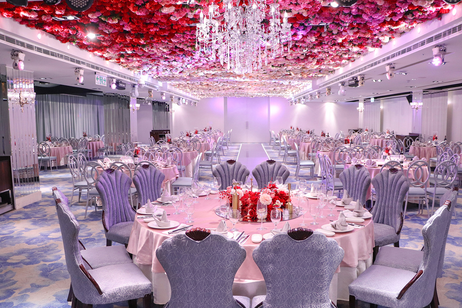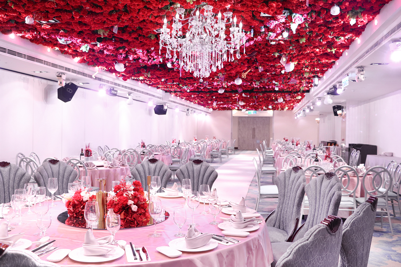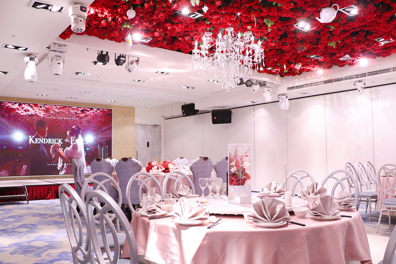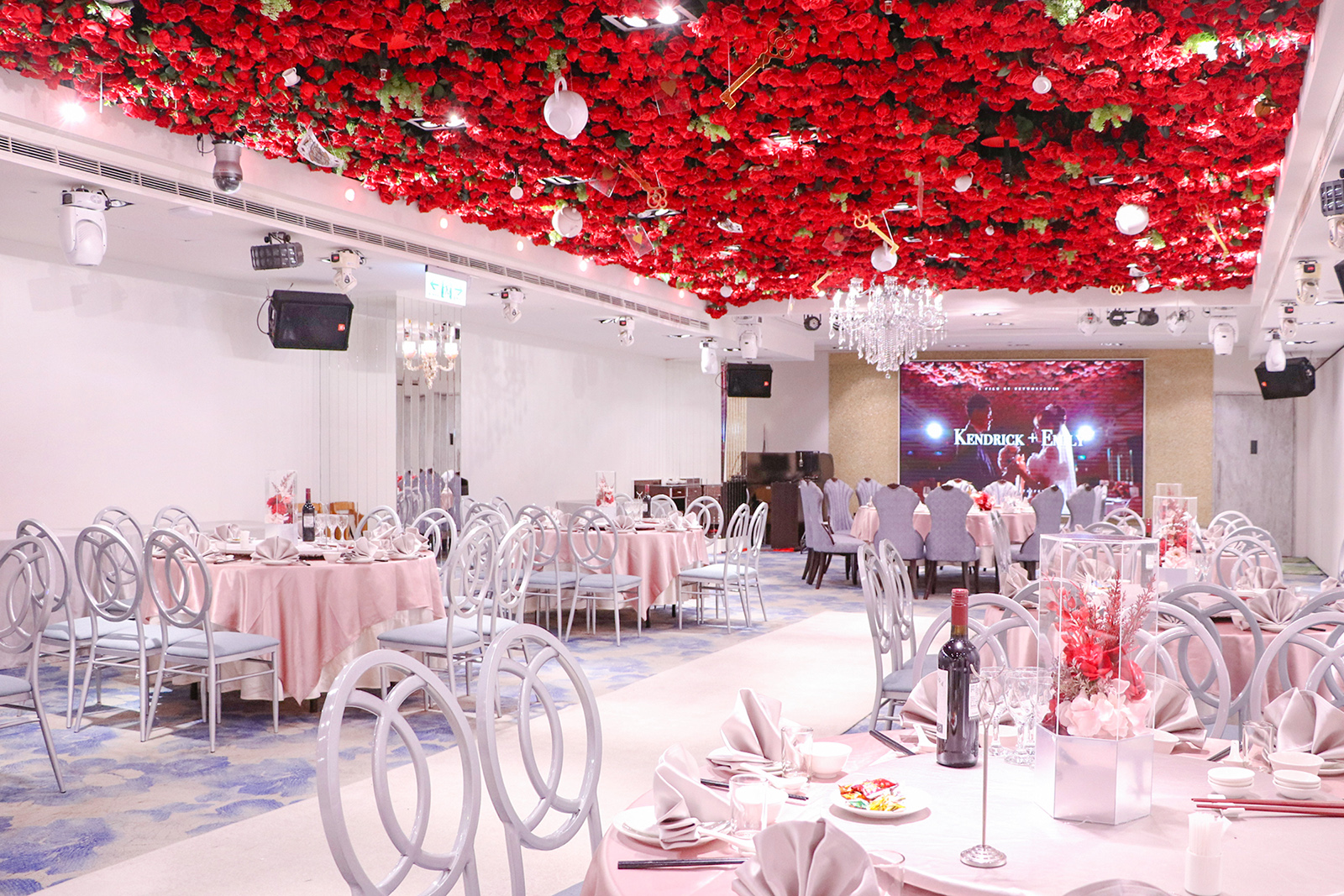 以浪漫的漸層玫瑰花作為主視覺,由淺粉至深紅色的漸層玫瑰花鋪滿長條型的宴會廳天花板, 再搭配歐風的淺色調桌巾、椅子與地毯,以及與漸層玫瑰相呼應的桌花擺設, 主桌上方再以一盞晶瑩剔透的水晶吊燈點亮空間,同時這盞水晶燈也為宴會廳空間帶來了視覺的重心,更有指引動線的效果!