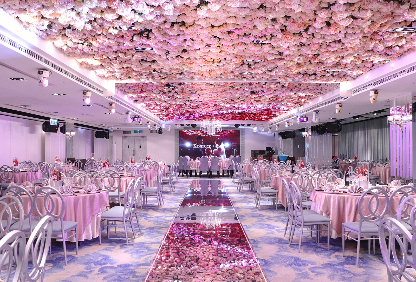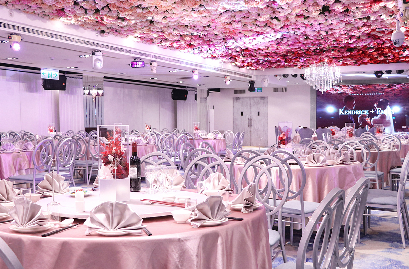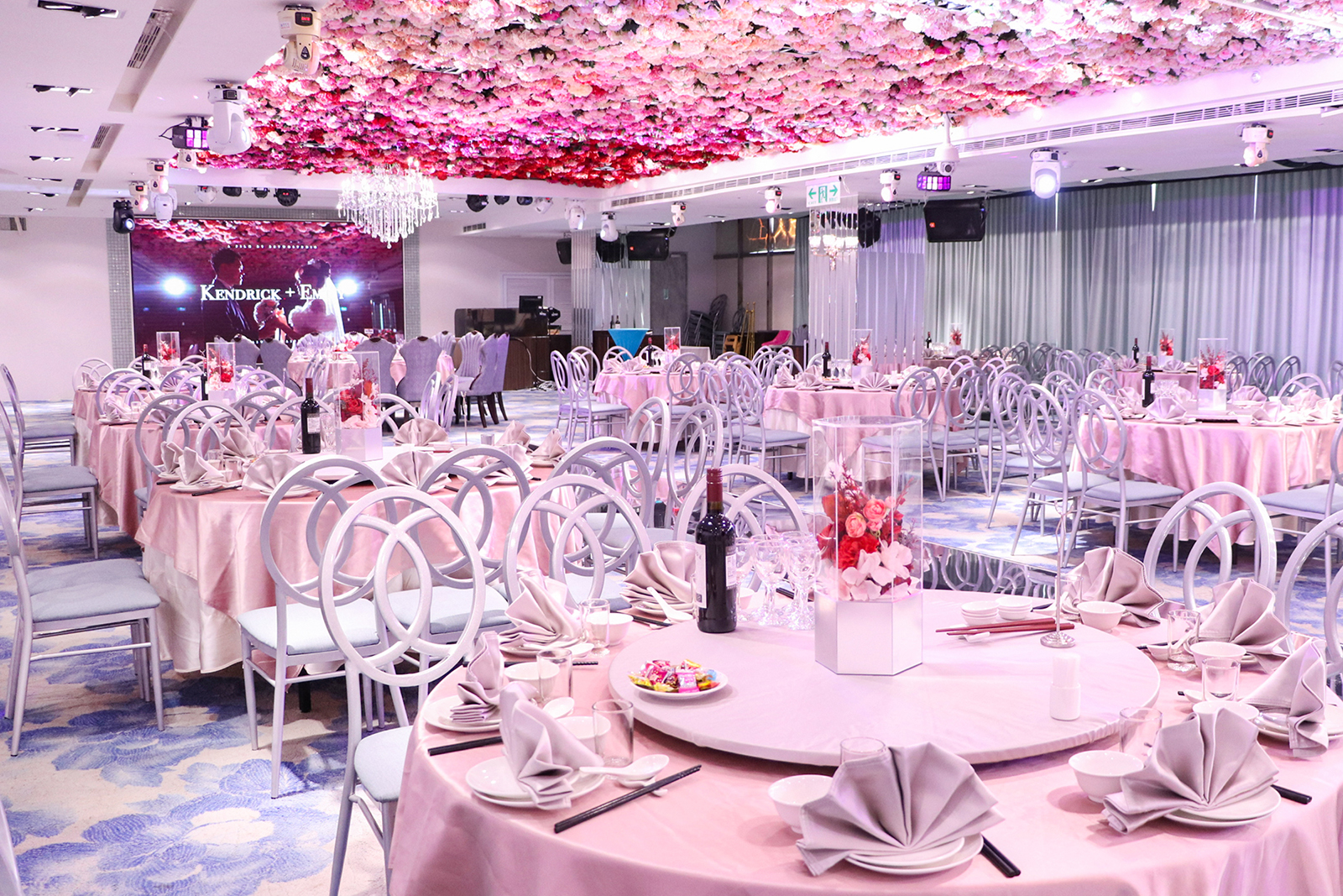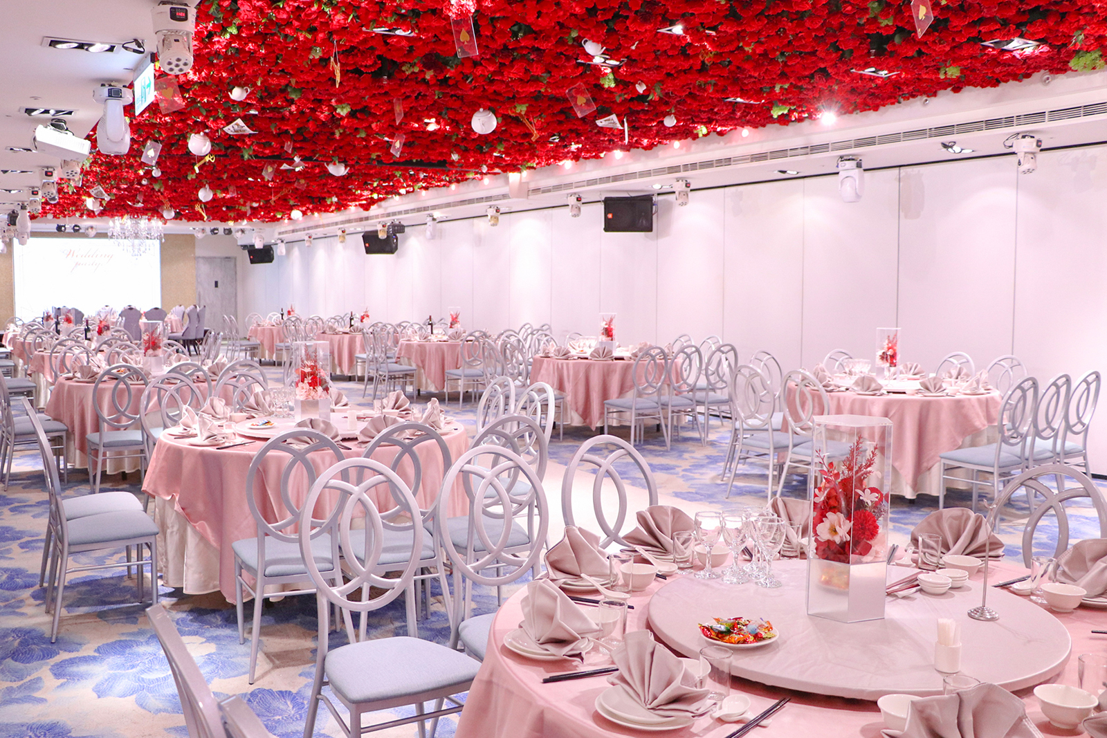 以浪漫的漸層玫瑰花作為主視覺,由淺粉至深紅色的漸層玫瑰花鋪滿長條型的宴會廳天花板, 再搭配歐風的淺色調桌巾、椅子與地毯,以及與漸層玫瑰相呼應的桌花擺設, 主桌上方再以一盞晶瑩剔透的水晶吊燈點亮空間,同時這盞水晶燈也為宴會廳空間帶來了視覺的重心,更有指引動線的效果!