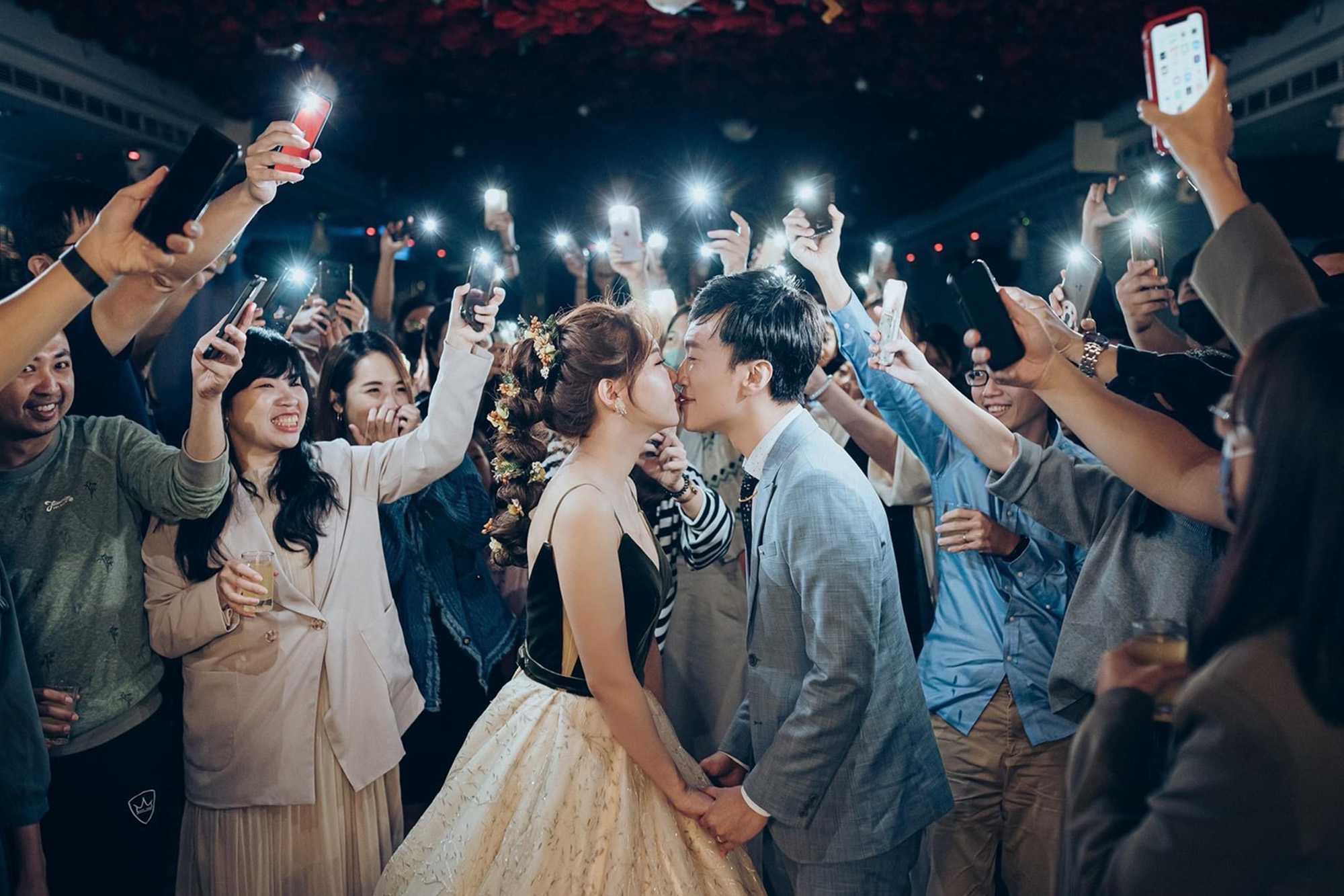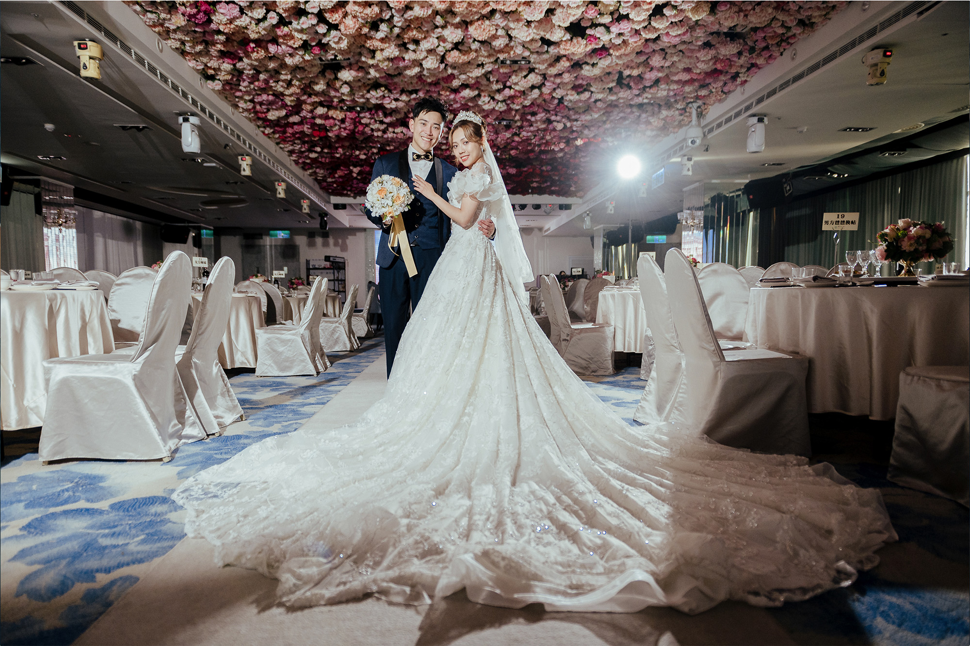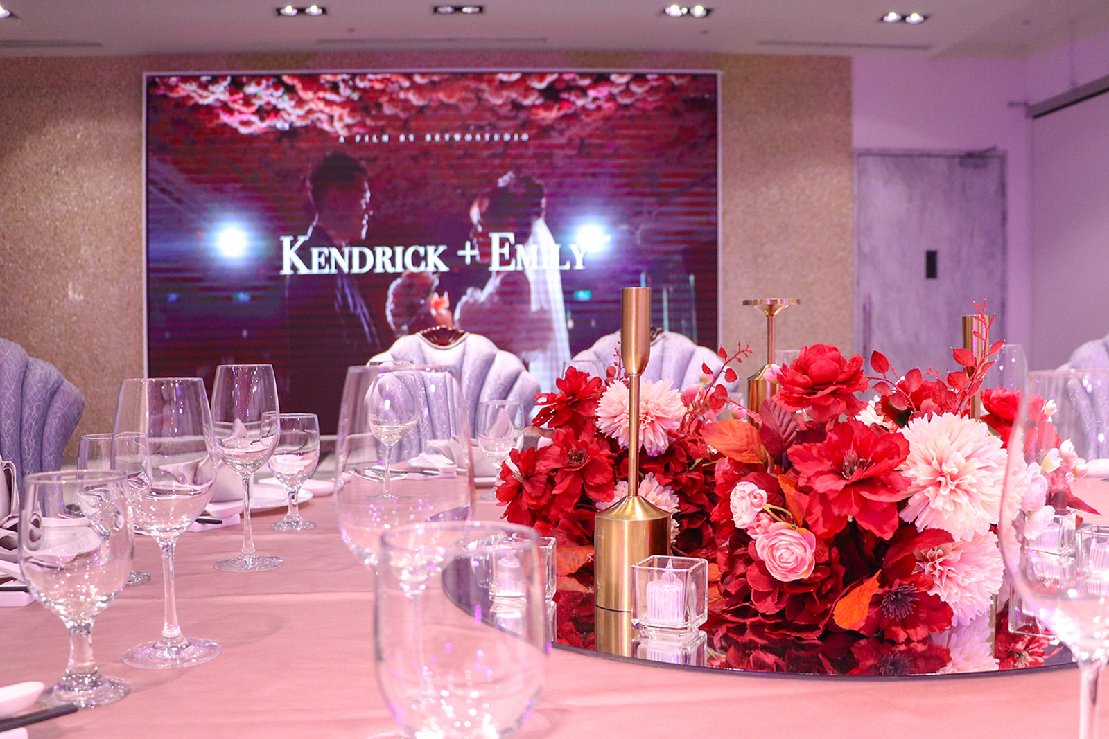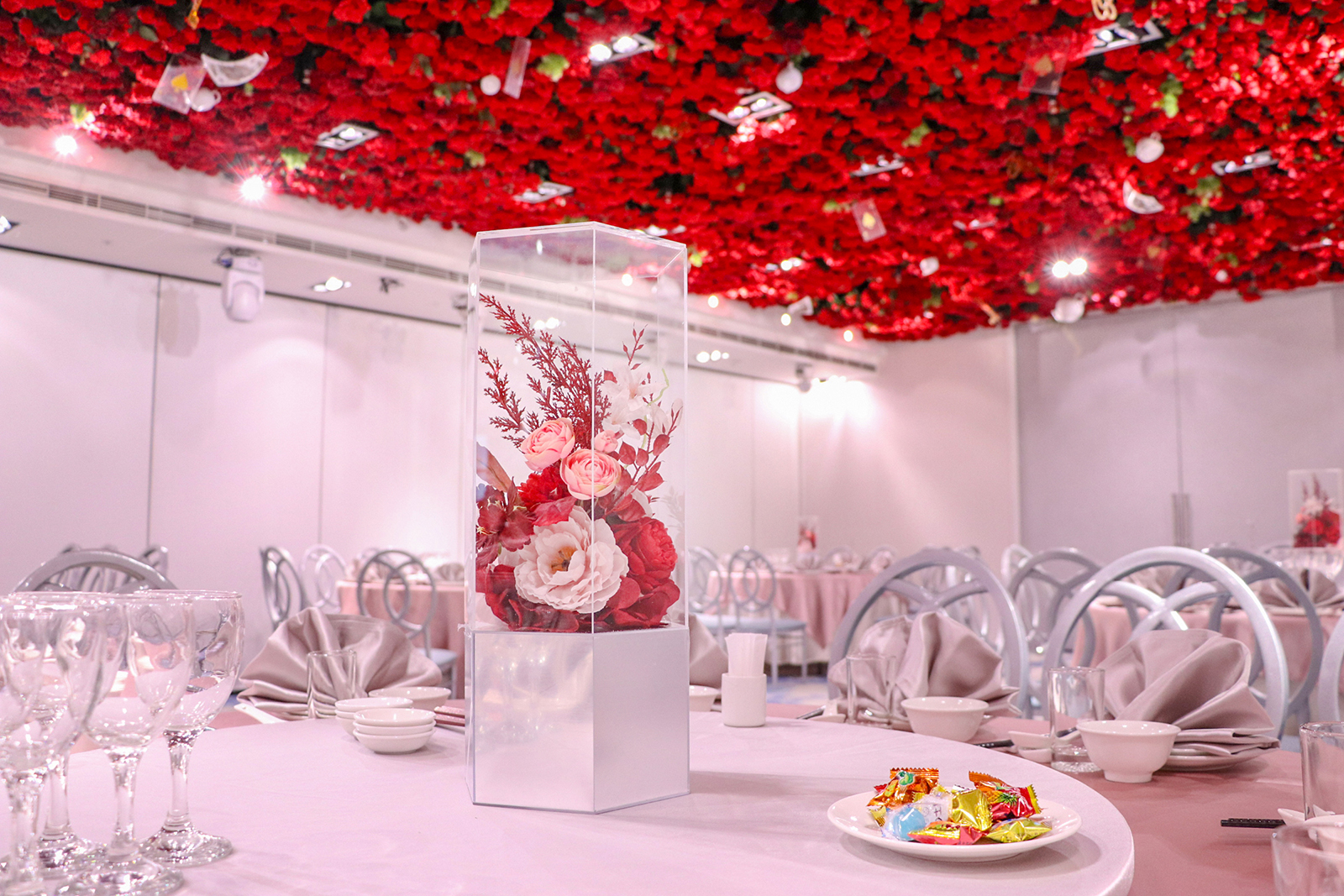 以浪漫的漸層玫瑰花作為主視覺,由淺粉至深紅色的漸層玫瑰花鋪滿長條型的宴會廳天花板, 再搭配歐風的淺色調桌巾、椅子與地毯,以及與漸層玫瑰相呼應的桌花擺設, 主桌上方再以一盞晶瑩剔透的水晶吊燈點亮空間,同時這盞水晶燈也為宴會廳空間帶來了視覺的重心,更有指引動線的效果!