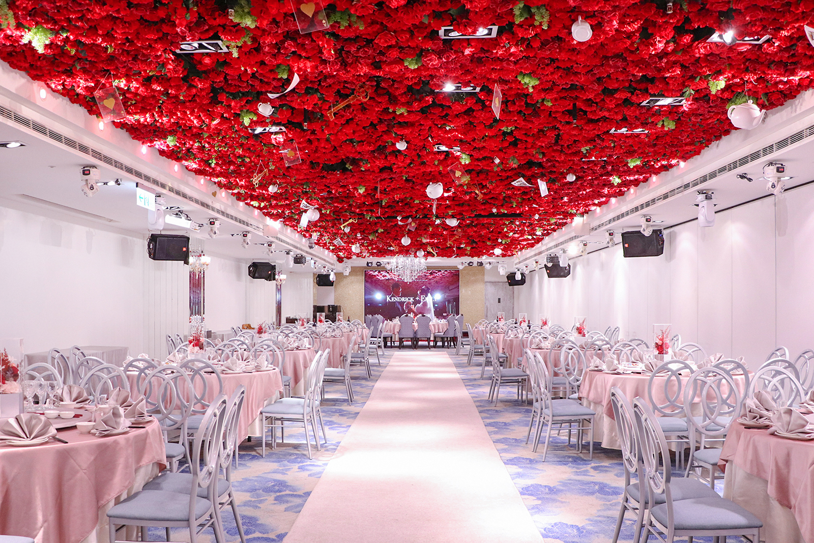 《愛麗絲夢遊仙境》的故事作為設計理念,以色彩強烈的紅色玫瑰為主, 紅玫瑰鋪成的花海中夾雜著一些些綠意點綴,更襯托出紅玫瑰的嬌豔, 鑰匙、茶壺、撲克牌等故事裡的代表元素也通通融入到宴會廳中, 彷彿將《愛麗絲夢遊仙境》故事中的茶園下午茶聚會帶進現實世界~
