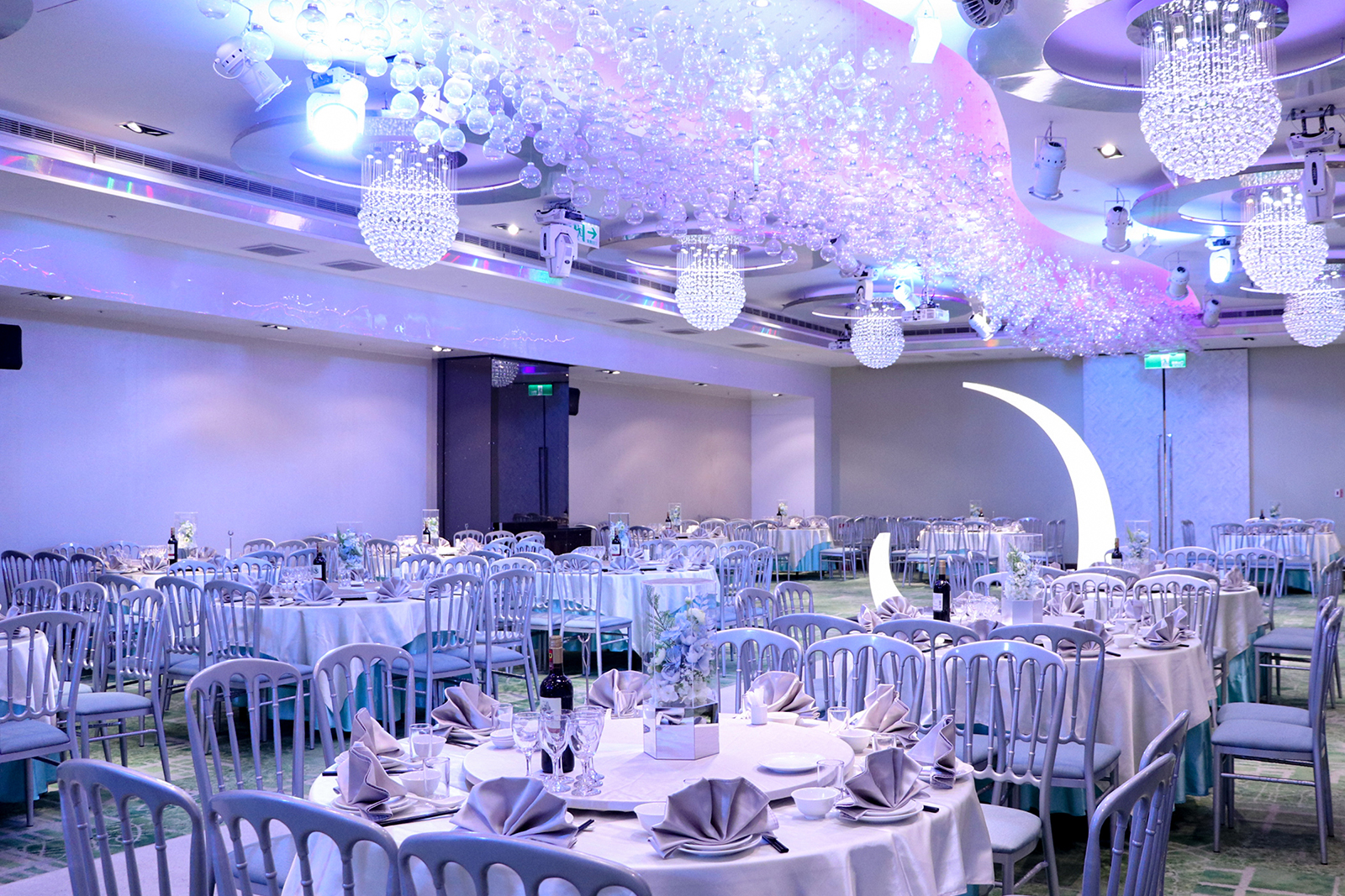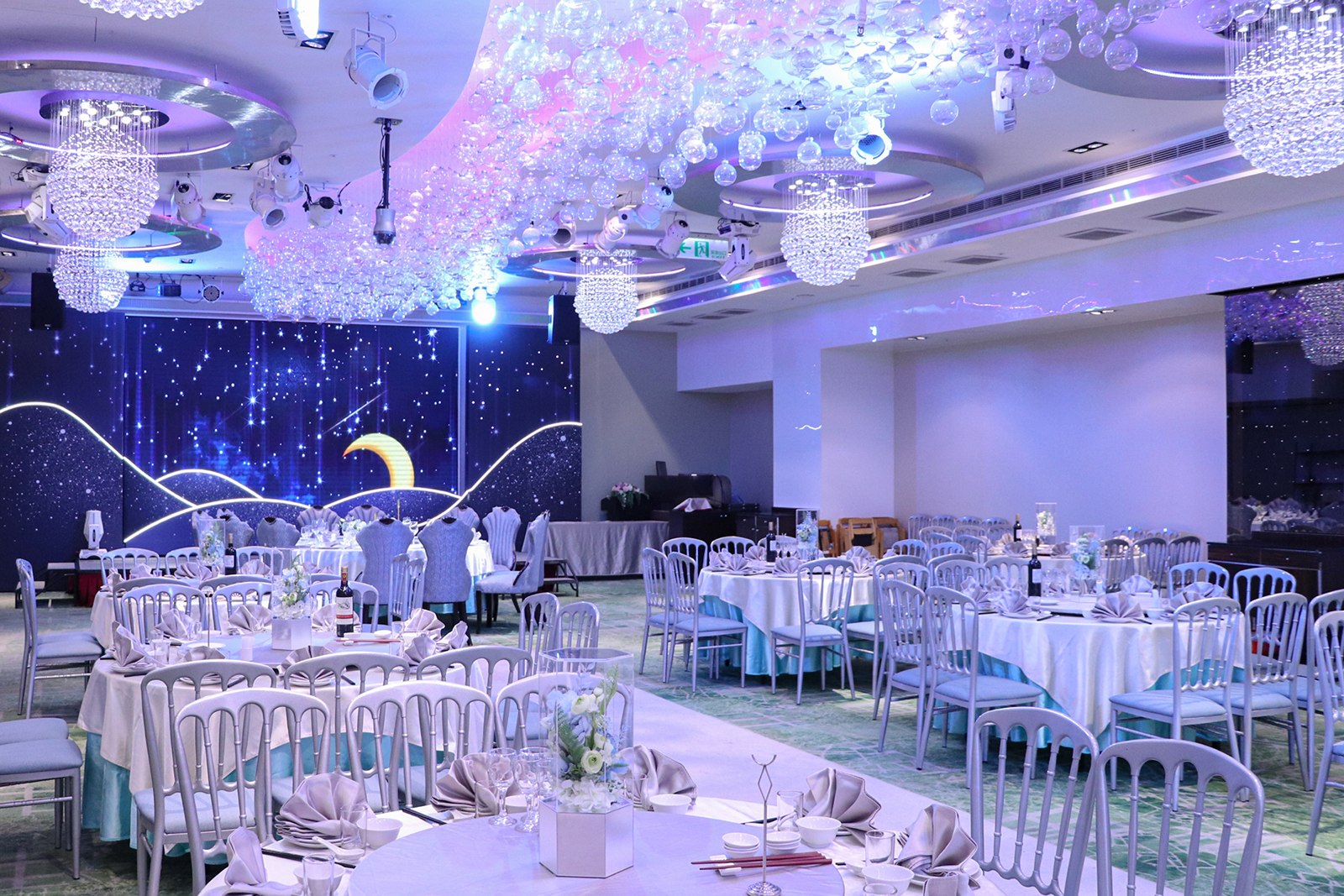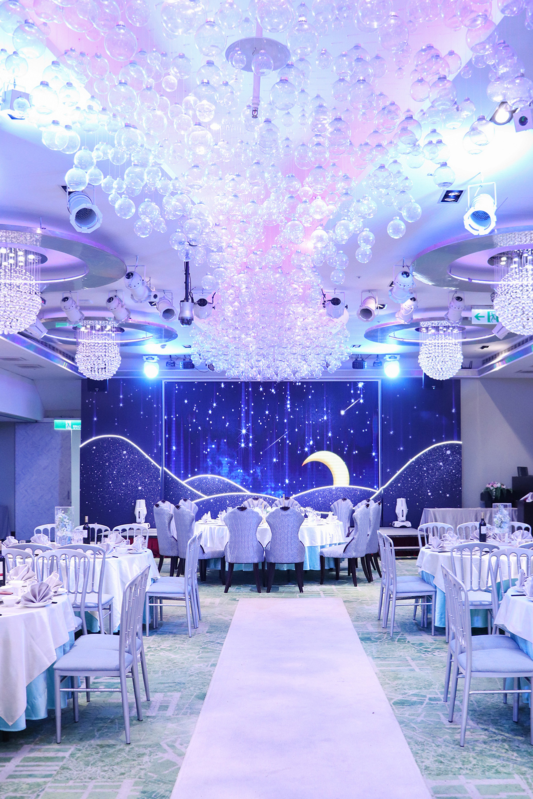 「天空之城」宴會廳中的裝飾元素充滿了現代感, 天花板不見玫瑰花海,而是結合了一顆顆透明輕巧的玻璃泡泡, 以裝載夢想的幸福泡泡,營造出充滿羅曼蒂克氛圍的夢幻婚宴場地。 玻璃泡泡藉由光源通過產生宛如水晶一般的折射, 隨著燈源的變換,璀璨的光芒五彩繽紛地輝映整座宴會廳空間,令人炫目不已~