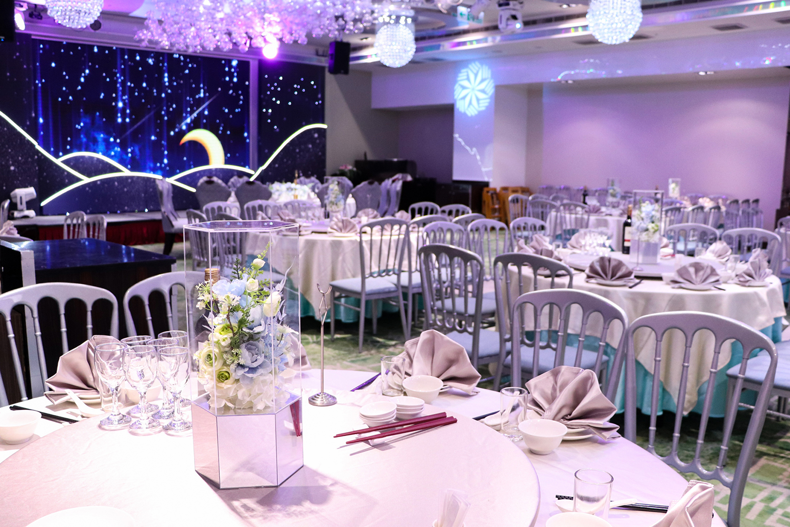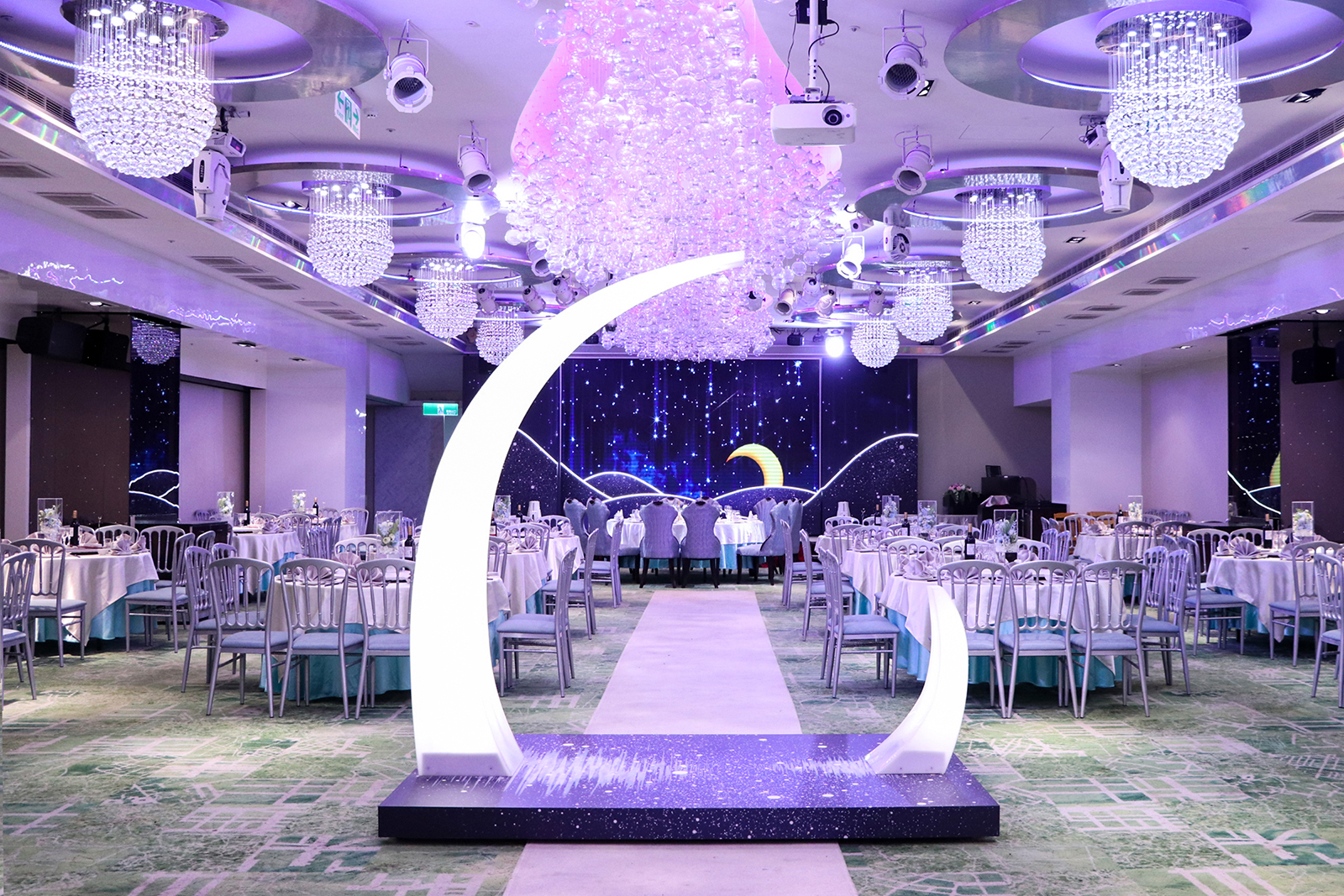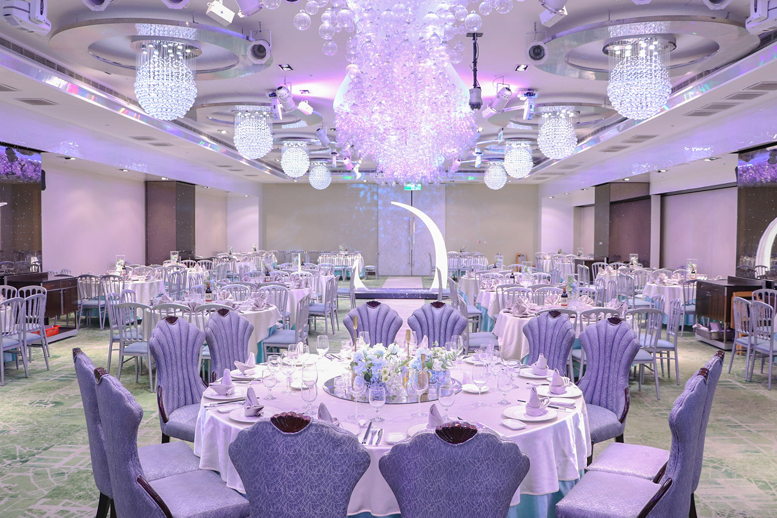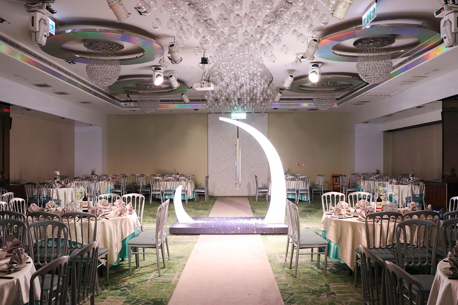 「天空之城」宴會廳中的裝飾元素充滿了現代感, 天花板不見玫瑰花海,而是結合了一顆顆透明輕巧的玻璃泡泡, 以裝載夢想的幸福泡泡,營造出充滿羅曼蒂克氛圍的夢幻婚宴場地。 玻璃泡泡藉由光源通過產生宛如水晶一般的折射, 隨著燈源的變換,璀璨的光芒五彩繽紛地輝映整座宴會廳空間,令人炫目不已~